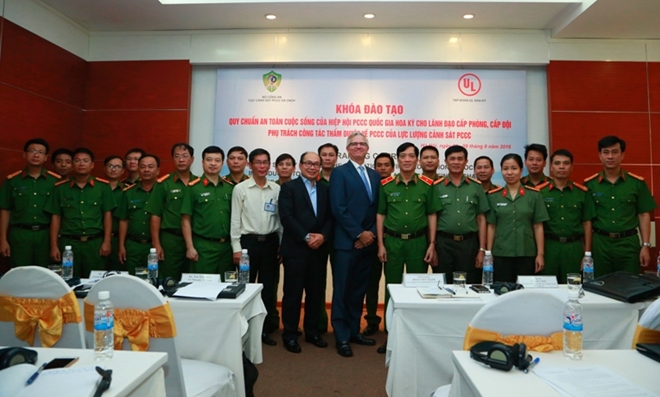 | Thiếu tướng Đoàn Việt Mạnh, Cục trưởng Cục Cảnh sát PCCC & CNCH; đại diện Tập đoàn UL Hoa Kỳ và các đại biểu tham dự khóa đào tạo |