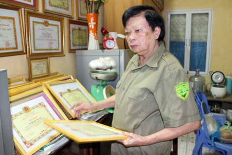 | Bà Lịch nâng niu những tấm giấy khen được các cấp tặng những năm qua. |