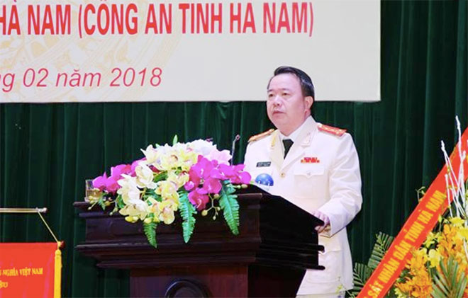 Bí thư Đảng ủy, Giám đốc Công an tỉnh Hà Nam Đại tá Nguyễn Văn Trung phát biểu tại Lễ mừng công. |