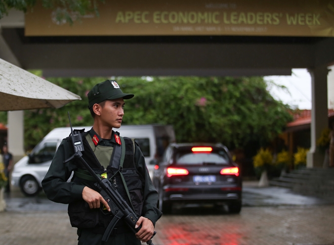 | Chiến sĩ cảnh sát cơ động canh gác tại địa điểm diễn ra Hội nghị tổng kết quan chức cấp cao APEC. |