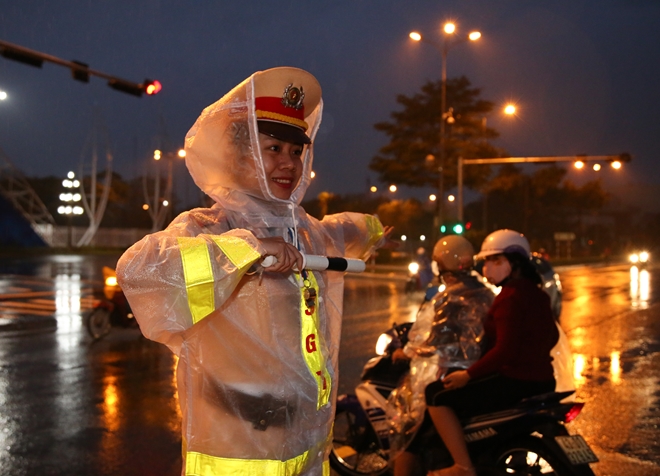 | Một nữ chiến sĩ CSGT điều tiết giao thông tại nút giao gần Trung tâm Báo chí trong mưa lớn và gió giật mạnh. |