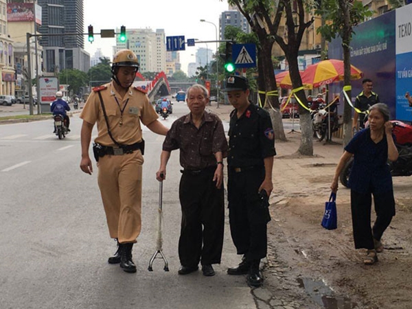 | Tổ công tác Y8/141 giúp đỡ cụ ông ở phường Láng Hạ đi đến nơi bầu cử an toàn. |