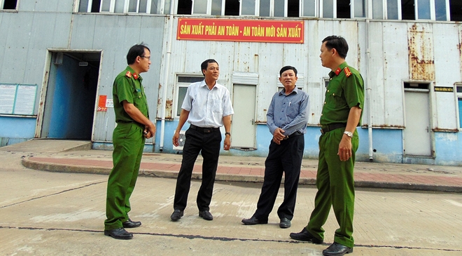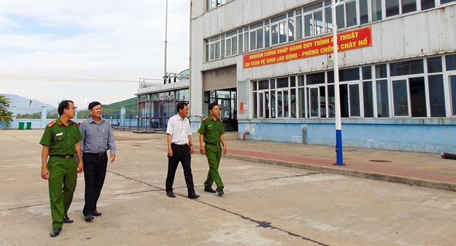 | Lực lượng Công an huyện Nông Sơn cùng lãnh đạo NMNĐ Nông Sơn phối hợp tuần tra, kiểm tra ANTT trong khu vực nhà máy. |