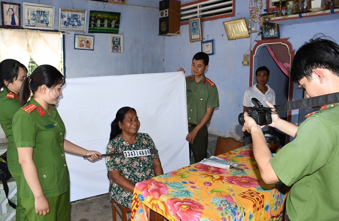 | Hội Phụ nữ Công an huyện Tiểu Cần làm thủ tục cấp giấy CMND cho người khuyết tật tại nhà. Ảnh: Hồ Giang |