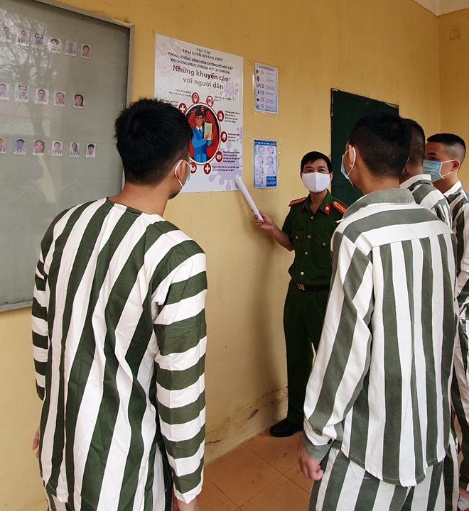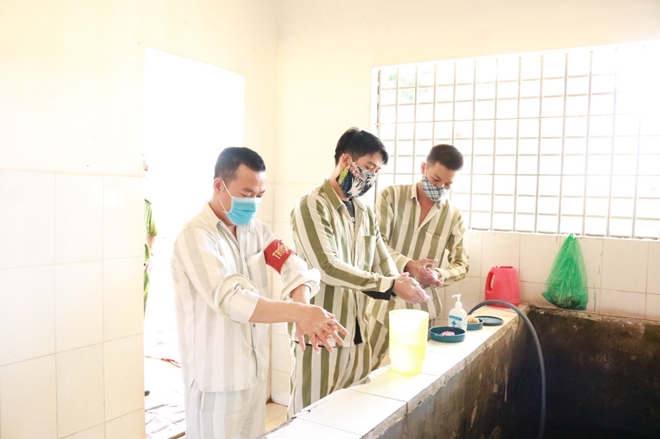 Đối với CBCS ra vào trại giam cũng đều phải tuân thủ chặt chẽ các yêu cầu về phòng dịch. Các cơ sở giam giữ đều được phun khử trùng đầy đủ thường xuyên, sử dụng nước rửa tay, khẩu trang theo quy định.
