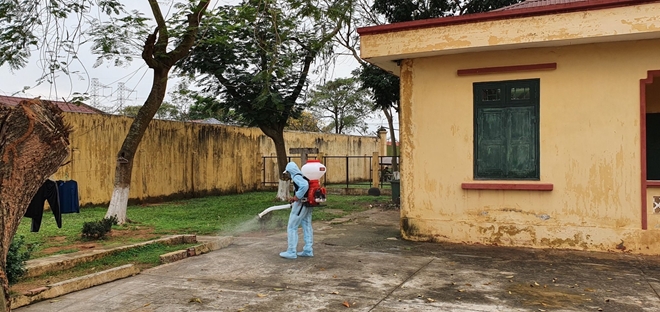 | Cán bộ trại giam Hoàng Tiến phun thuốc khử trùng |