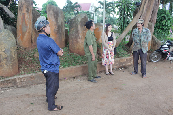 | Người bị hại và một số người dân tham gia bắt đối tượng cướp giật kể lại sự việc với Công an xã Đức Mạnh. |