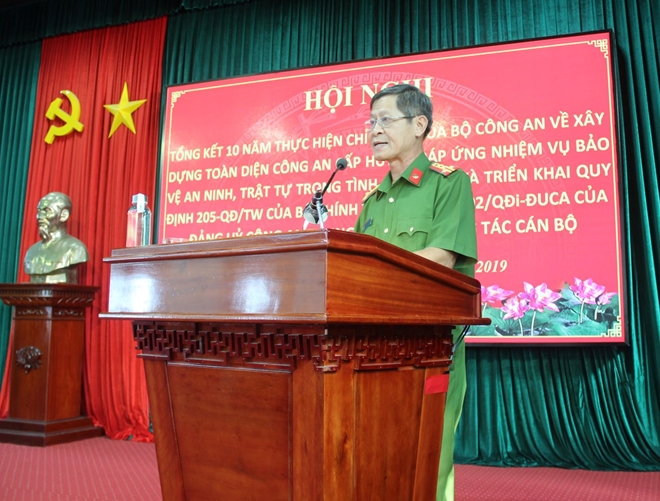 Đại tá Nguyễn Trường Sơn, Phó Giám đốc Công an tỉnh Thừa Thiên Huế báo cáo tổng kết 10 năm thực hiện Chỉ thị số 03 Bộ Công an.