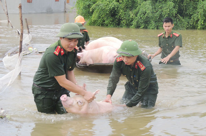 | Công an tỉnh Hà Nam giúp dân trong mưa lũ. |