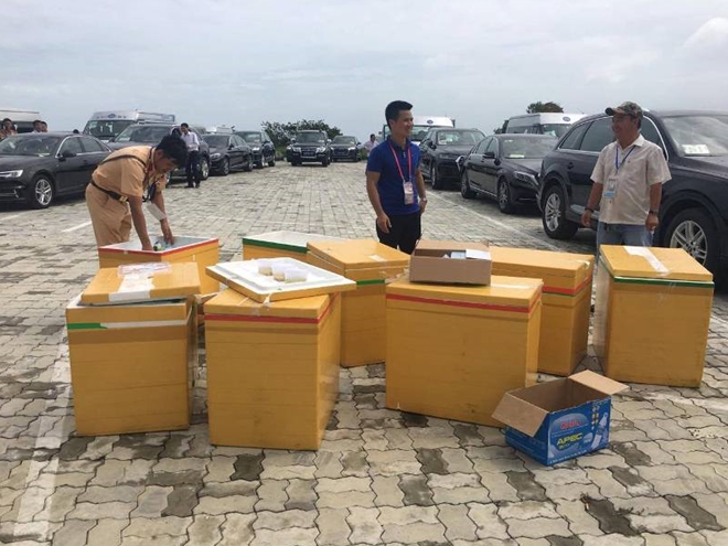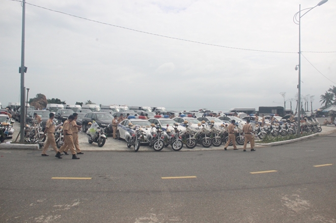 | Các đoàn xe tập trung tại bãi đỗ xe ở bán đảo Sơn Trà để chờ lệnh đưa đón các đại biểu. |