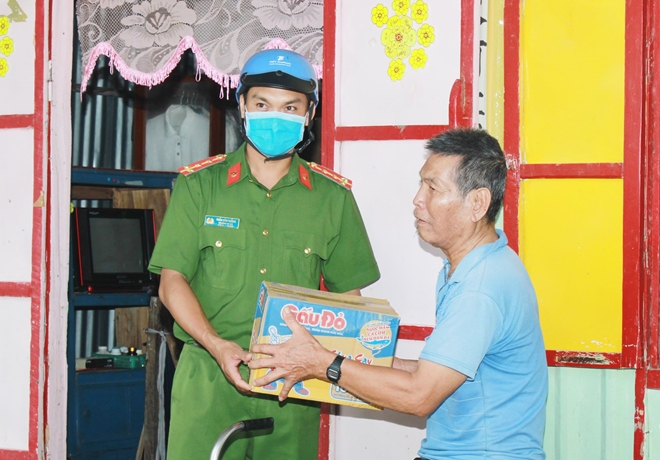 | Công an xã Châu Hưng A, huyện Vĩnh Lợi (Bạc Liêu), tặng quà gia đình khó khăn vượt qua dịch COVID-19. |