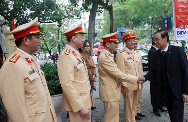 | Phó Bí thư Thành ủy Đào Đức Toàn, Phó Giám đốc Công an TP Hà Nội Nguyễn Văn Viện cùng các cán bộ chỉ huy Phòng CSGT Hà Nội. |