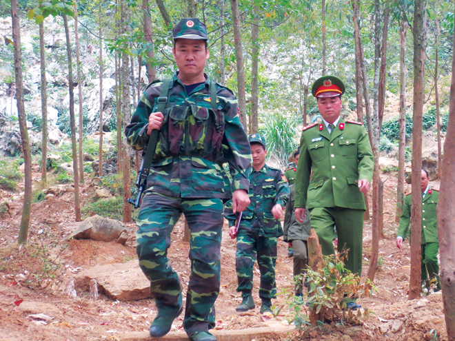 | Tổ công tác của Công an huyện Văn Lãng và Đồn Biên phòng Tân Thanh tuần tra tại khu vực Hang Dơi. |