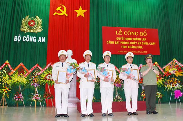 | Thượng tướng Bùi Quang Bền, Thứ trưởng Bộ Công an trao quyết định thành lập Cảnh sát PCCC tỉnh Khánh Hòa và quyết định điều động, bổ nhiệm cán bộ. |