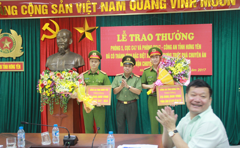 | Đại tá Đỗ Đình Hào, Giám đốc Công an tỉnh Hưng Yên trao thưởng cho đơn vị có thành tích xuất sắc trong công tác đấu tranh phòng, chống tội phạm ma túy. |