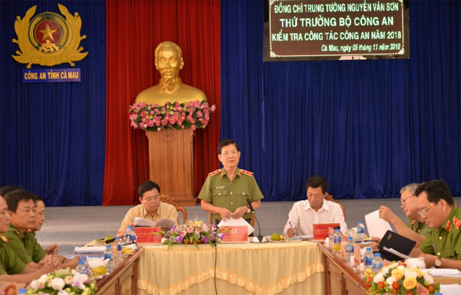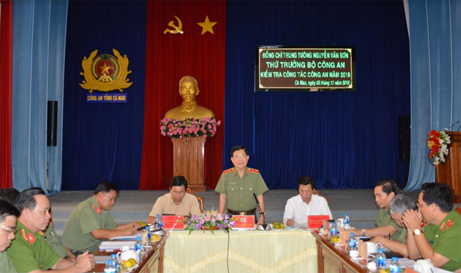 Phát biểu chỉ đạo buổi làm việc, Thứ trưởng Nguyễn Văn Sơn, biểu dương những kết quả công tác mà Công an Cà Mau đạt được thời gian qua. Thay mặt Đảng ủy Công an Trung ương và Bộ Công an, Thứ trưởng Nguyễn Văn Sơn chân thành cảm ơn Tỉnh uỷ, HĐND, UBND tỉnh, các cơ quan, ban, ngành và nhân dân tỉnh Cà Mau đã quan tâm chỉ đạo, phối hợp giúp đỡ lực lượng CAND nói chung, Công an Cà Mau nói riêng trong thời gian qua và mong rằng, tiếp tục nhận được sự quan tâm chỉ đạo, sự phối hợp giúp đỡ của đồng chí, đồng bào trong tỉnh thời gian tới.