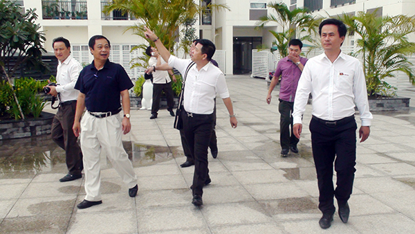 | Thượng tướng, Thứ trưởng Phạm Dũng cùng đại diện Tập đoàn Phú Cường đang đi kiểm tra tổng thể các tòa nhà chung cư |