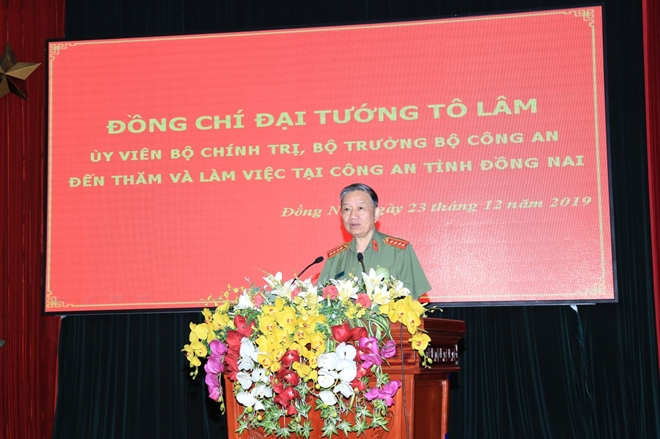 | Bộ trưởng Tô Lâm phát biểu chỉ đạo Công an Đồng Nai. |
