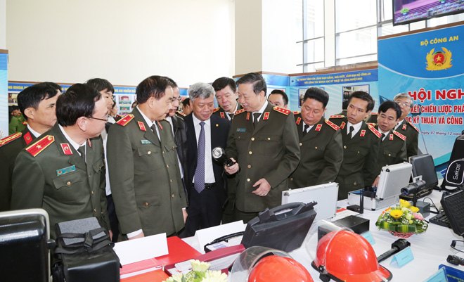 | Bộ trưởng Tô Lâm cùng các đại biểu tham quan triển lãm trang thiết bị công nghệ hiện đại phục vụ công tác Công an. |