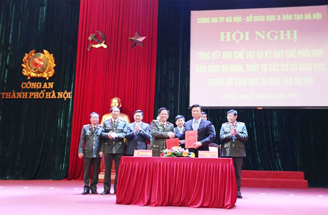 Sáng 27-2, Công an TP Hà Nội và Sở Giáo dục đào tạo (GD-ĐT) TP Hà Nội đã tổ chức Hội nghị Tổng kết quy chế 167 và ký quy chế phối hợp đảm bảo an ninh, trật tự (ANTT) các cơ sở giáo dục thuộc Sở GD-ĐT Hà Nội.