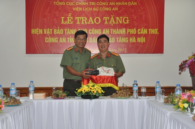 | Đại tá Nguyễn Xuân Ngọc, Phó Viện trưởng Viện Lịch sử CAND trao tặng hiện vật cho Công an Cần Thơ |