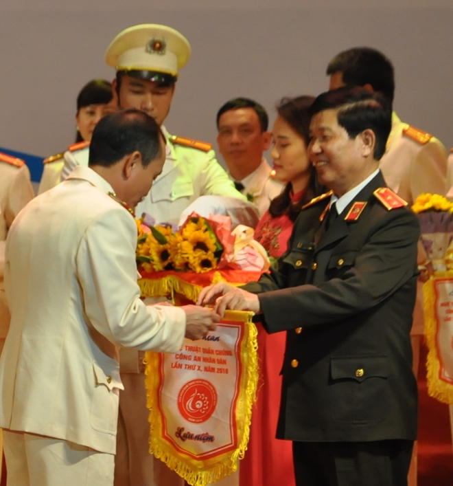 | Trung tướng Nguyễn Văn Sơn, Thứ trưởng Bộ Công an trao cờ lưu niệm cho các đoàn tham gia liên hoan |