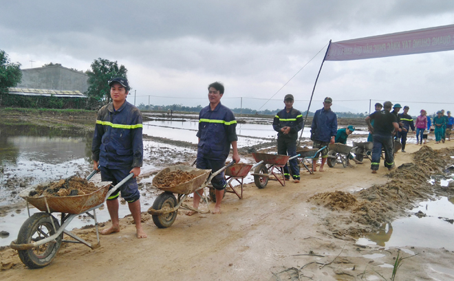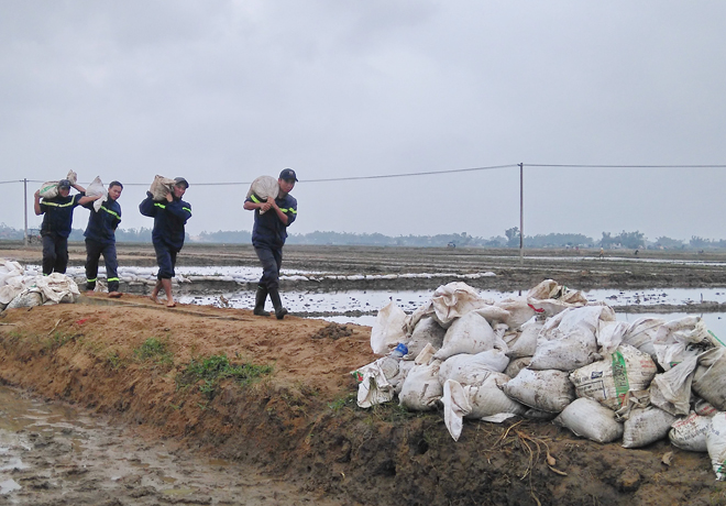 | Vận chuyển, bốc xếp bao cát gia cố bờ đất để chắn lũ tái diễn. |