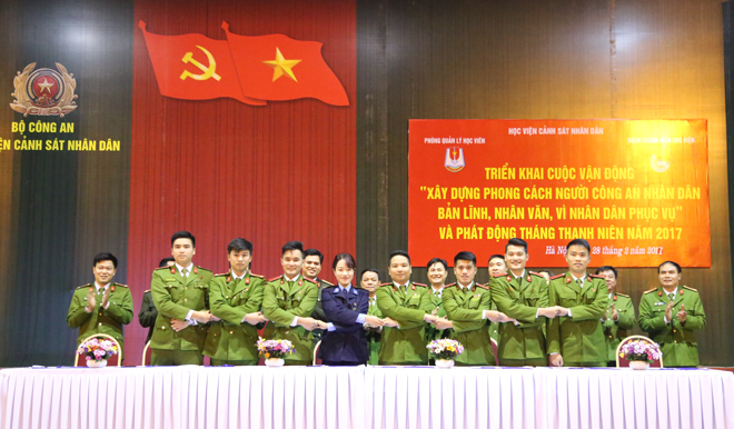 Tối ngày 28-2-2017, Học viện CSND đã tổ chức Chương trình triển khai cuộc vận động “Xây dựng phong cách người Công an nhân dân bản lĩnh, nhân văn, vì nhân dân phục vụ” và đại diện cho các khóa học hệ học đã tham gia kí kết thực hiện cuộc vận động và hưởng ứng tháng thanh niên năm 2017.