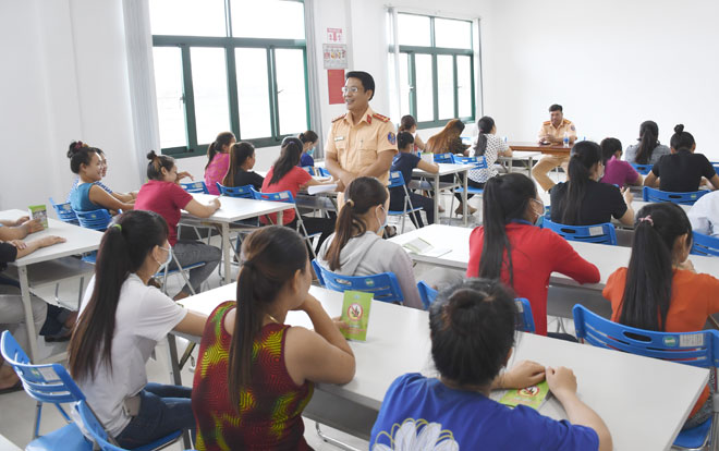 | Lực lượng CSGT tuyên truyền Luật Giao thông cho công nhân công ty giày da. |