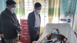 Thượng tá Đinh Thế Anh cùng Đoàn công tác đến bệnh viện thăm hỏi các nạn nhân bị thương trong vụ tai nạn.
