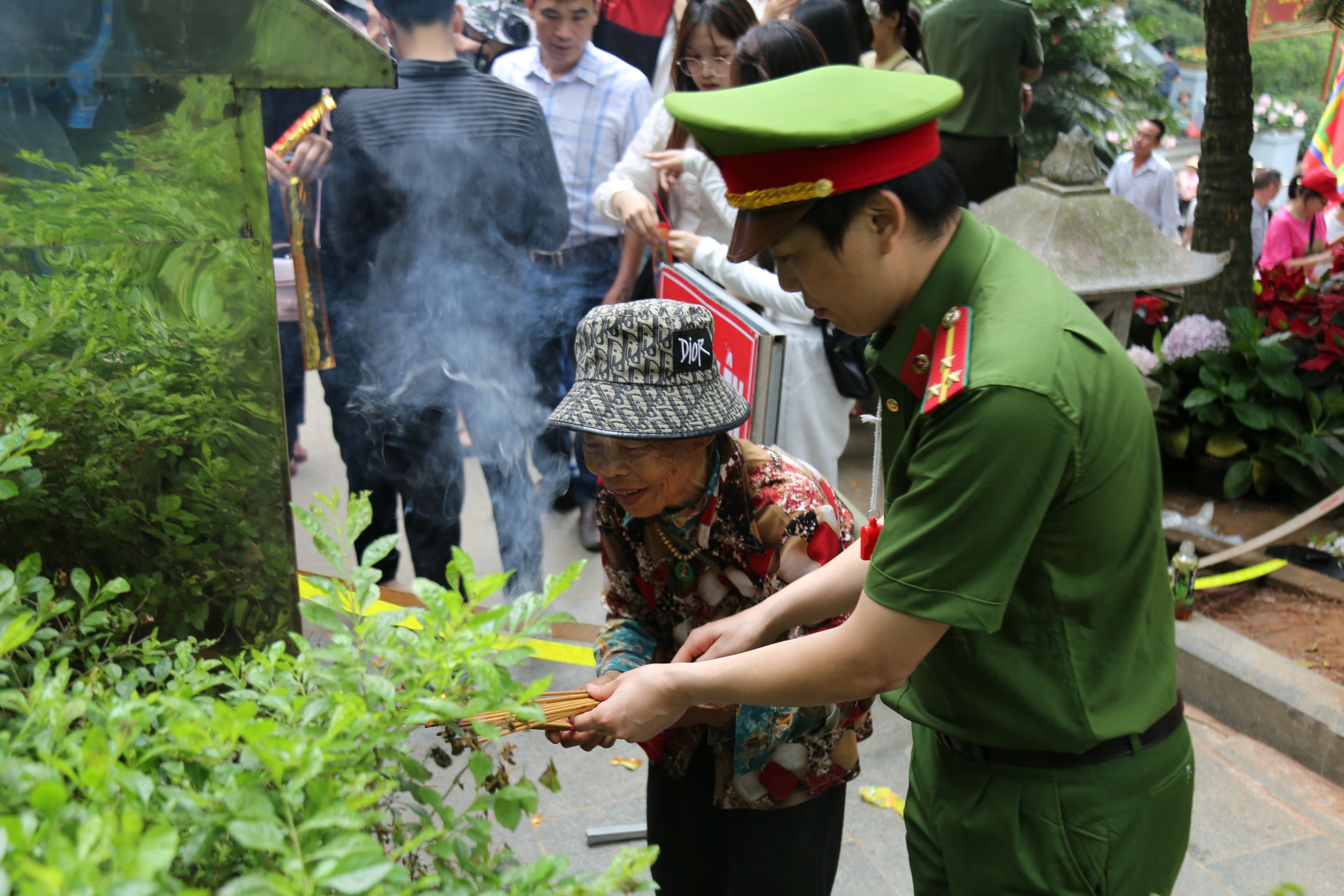 Trong dòng người hành hương về đất Tổ, có cụ bà Nguyễn Thị Đãi (89 tuổi), quê ở khu vực chùa Tây Phương, Hà Nội, tuy tuổi đã cao nhưng cụ vẫn đi lại nhanh nhẹn, giọng nói khỏe khoắn, cho biết rất xúc động khi được về đây trong không khí thiêng liêng của ngày Giỗ Tổ. Cụ Đãi cho hay, năm nay cụ thấy không khí khác với mọi năm, trong đó có nhiều cán bộ Công an chốt trực, ở đâu cũng thấy sắc quân phục màu xanh, ai cần hỏi gì cũng hướng dẫn tận tình.