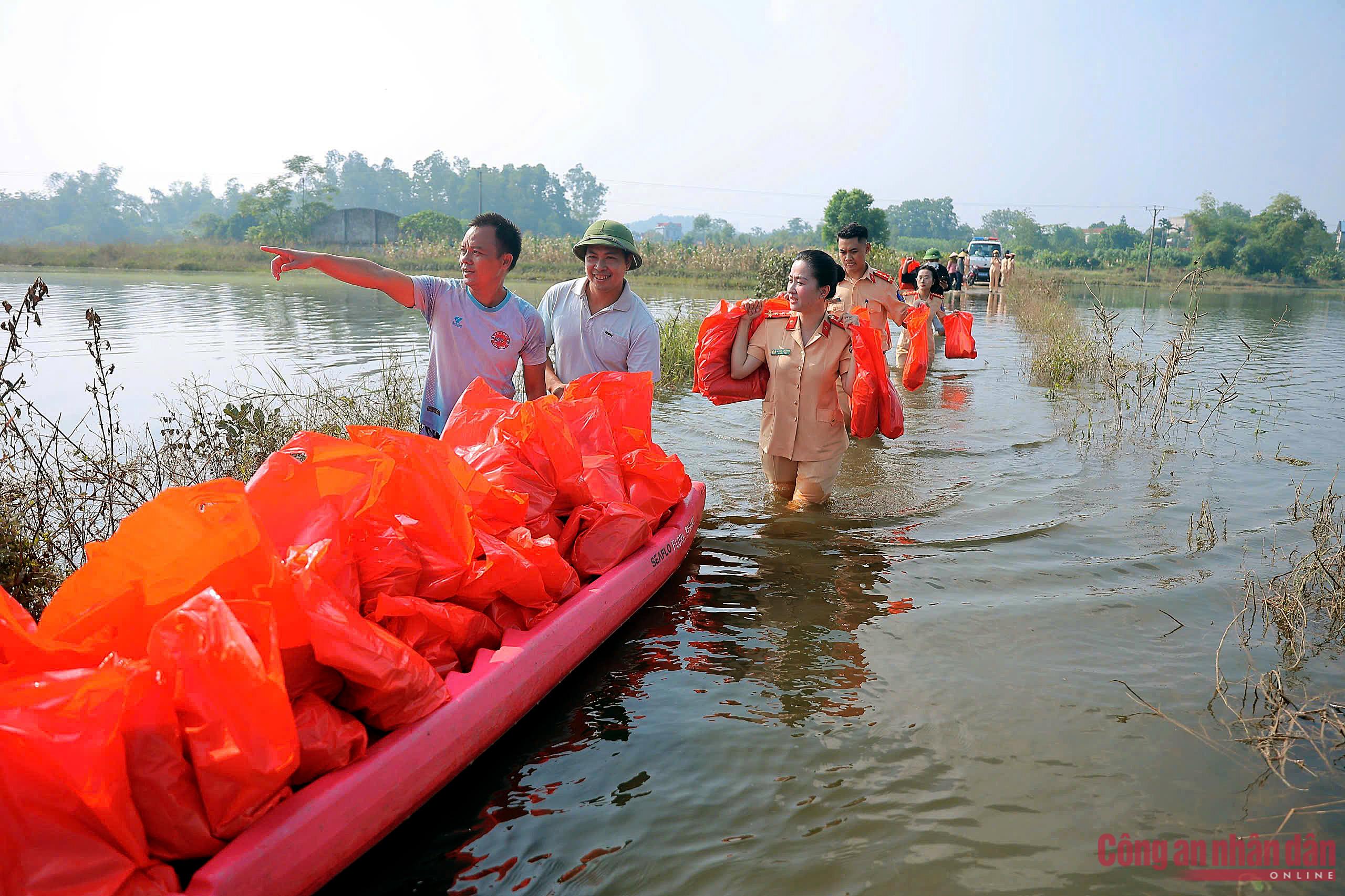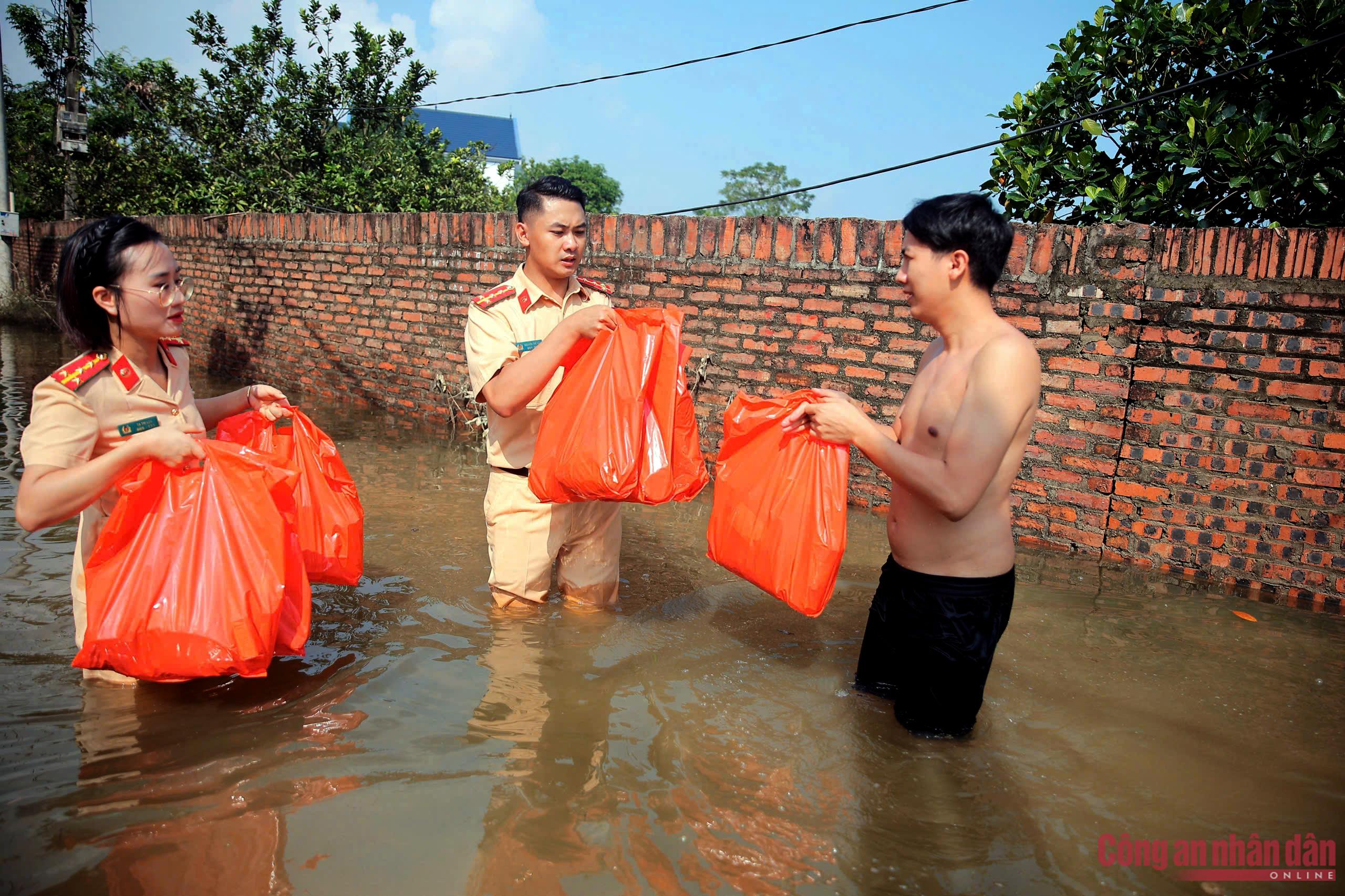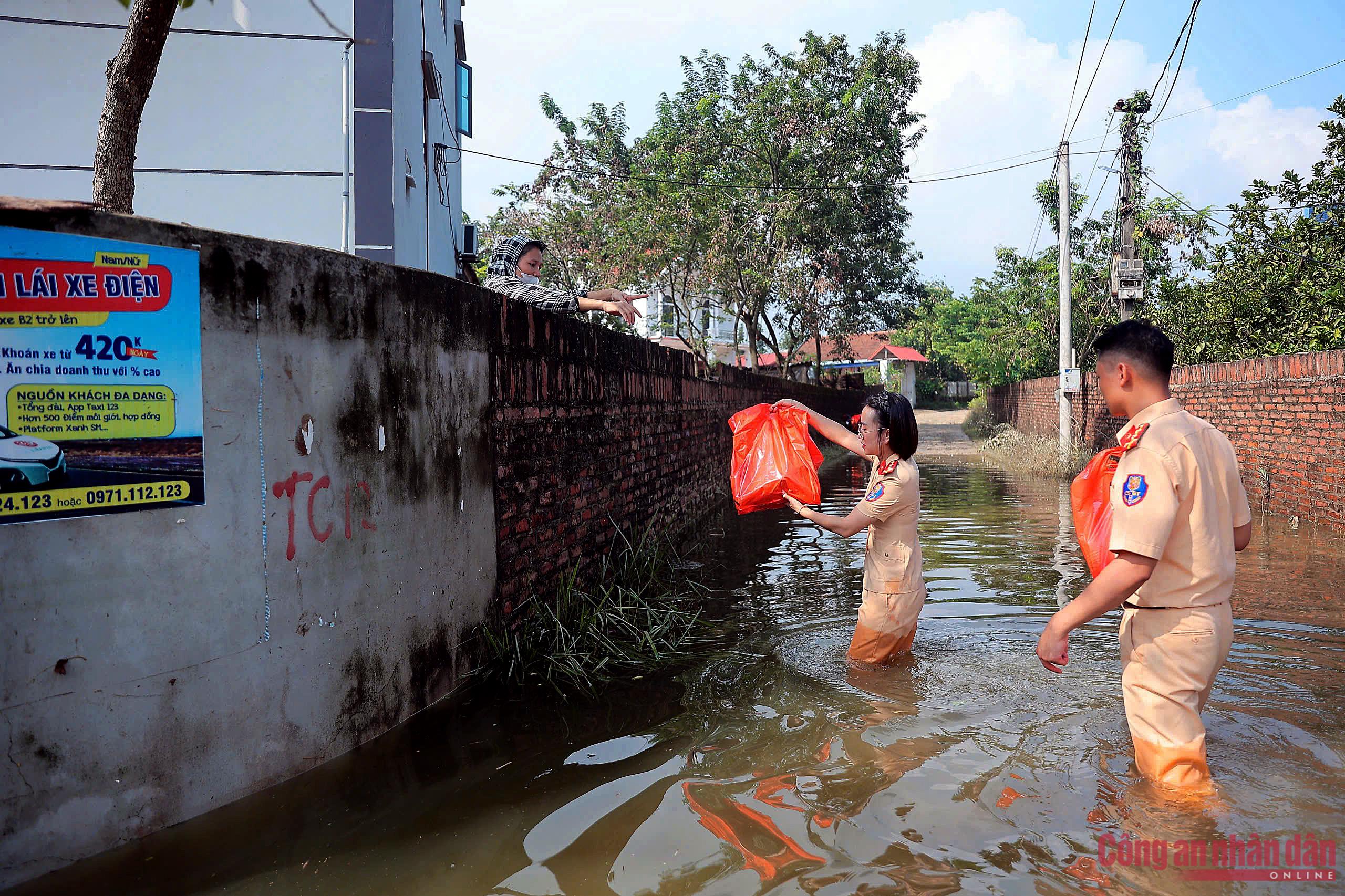 Ngày 12/10, PV Báo CAND cùng với cán bộ, chiến sĩ Phòng CSGT Công an TP Hà Nội mà nòng cốt là đoàn viên Đoàn Thanh niên và Hội Phụ nữ Phòng hành quân xuống vùng tâm lũ tại địa bàn các xã Thư Lâm, Đa Phúc, Trung Giã (Hà Nội).