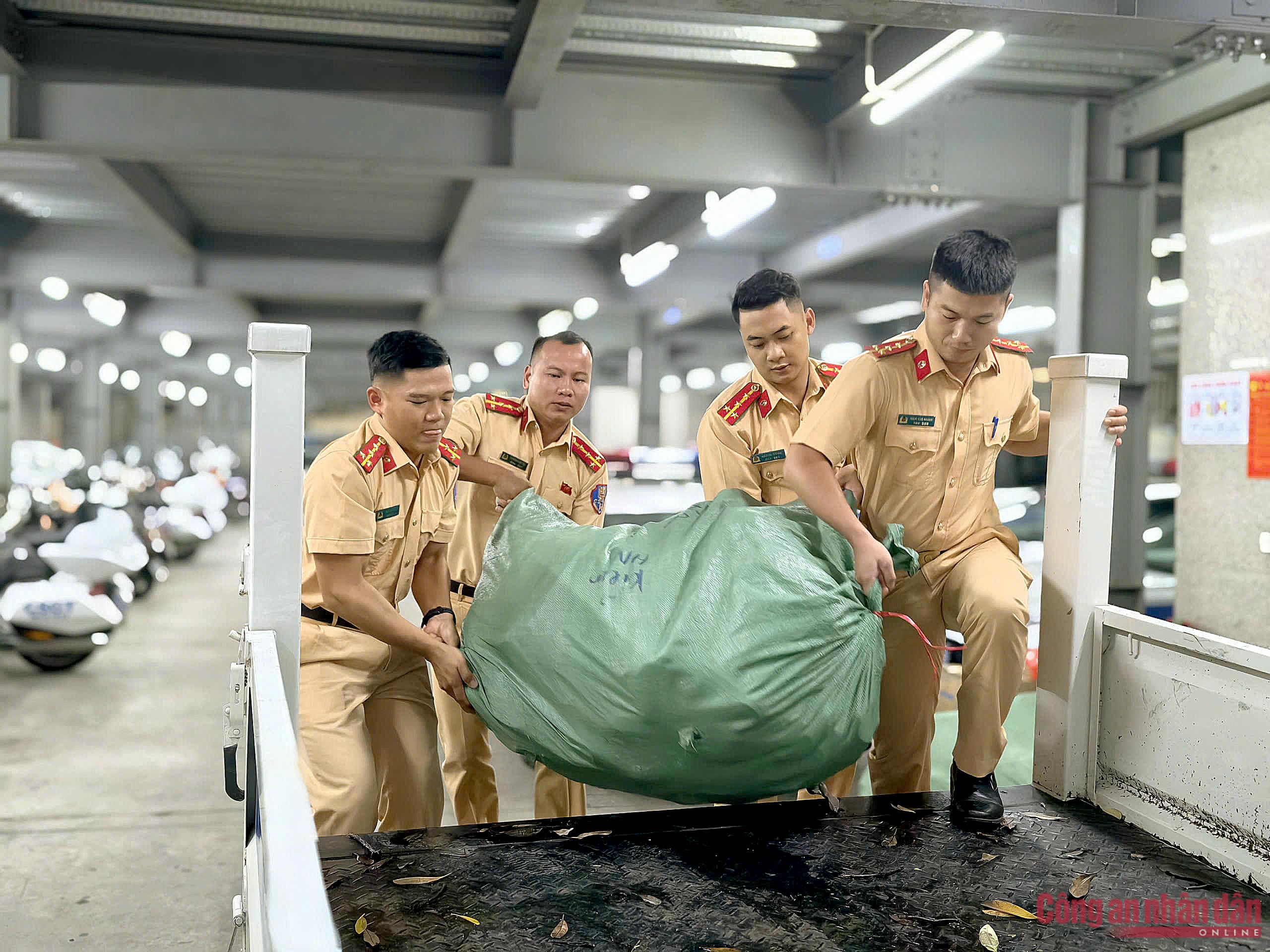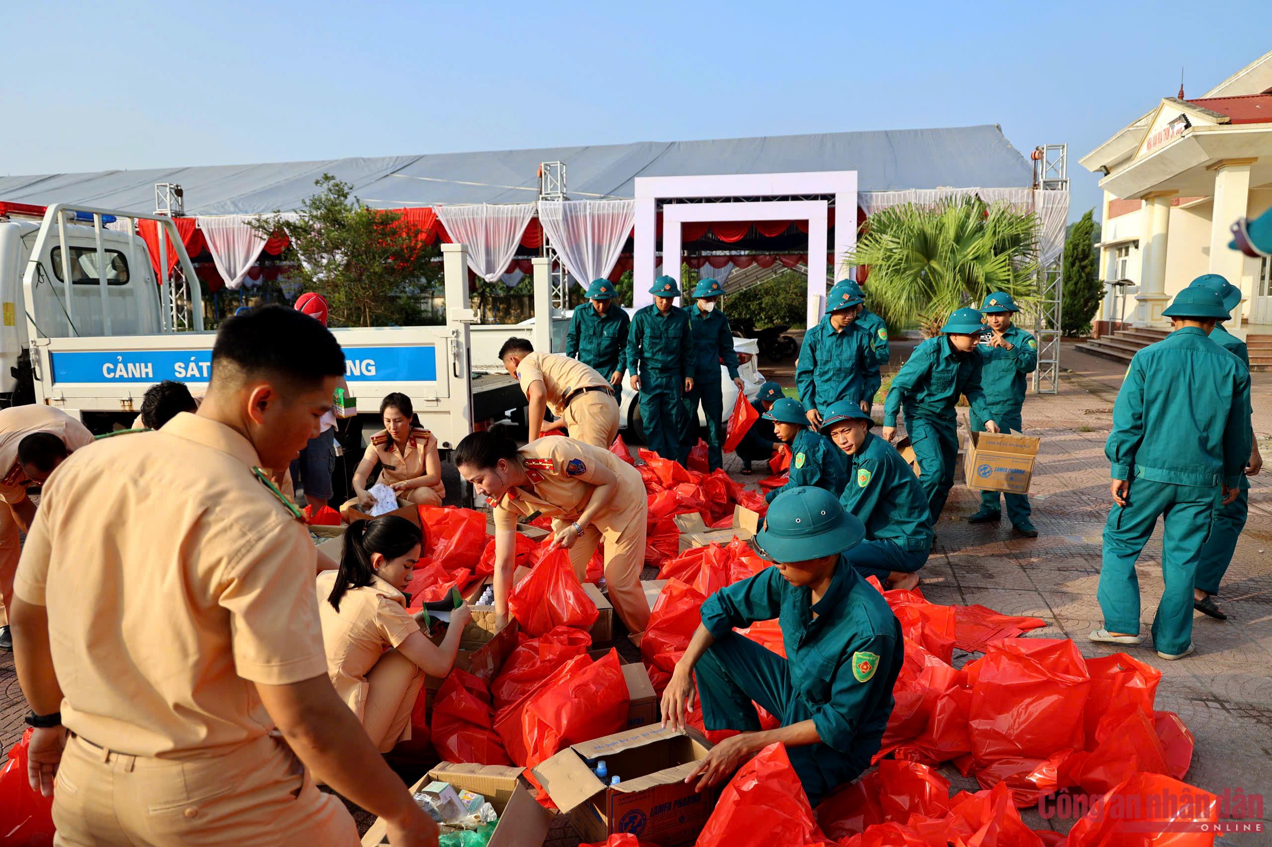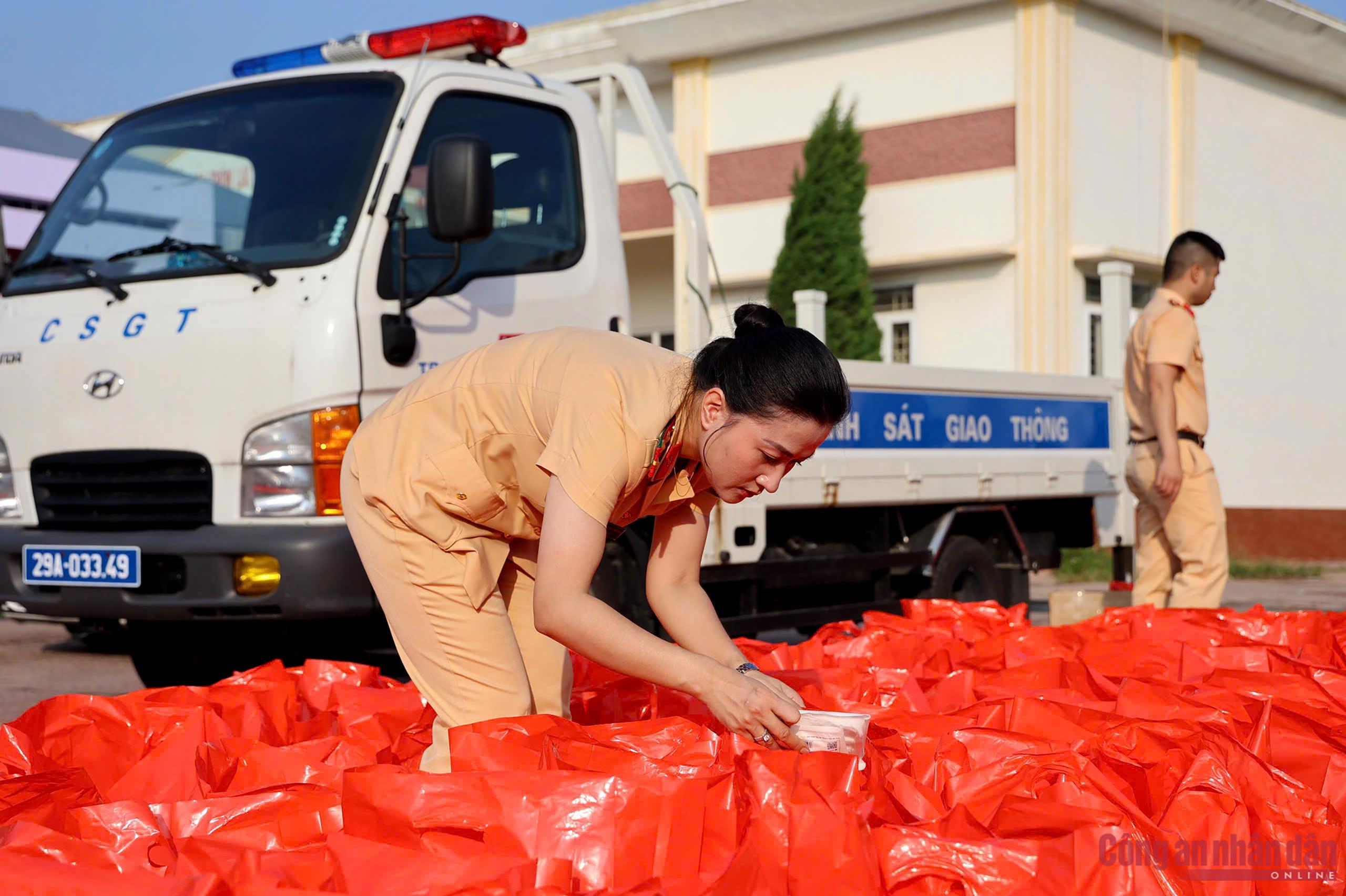 Cán bộ, chiến sĩ CSGT Hà Nội có một đêm không ngủ để chuẩn bị, kiểm tra kỹ lưỡng hàng hóa, trang bị, nhu yếu phẩm thiết yếu trước khi hành quân vào vùng tâm lũ hỗ trợ người dân.