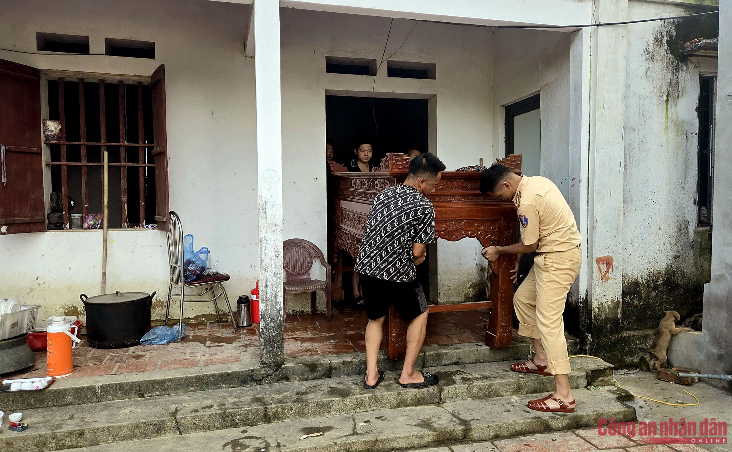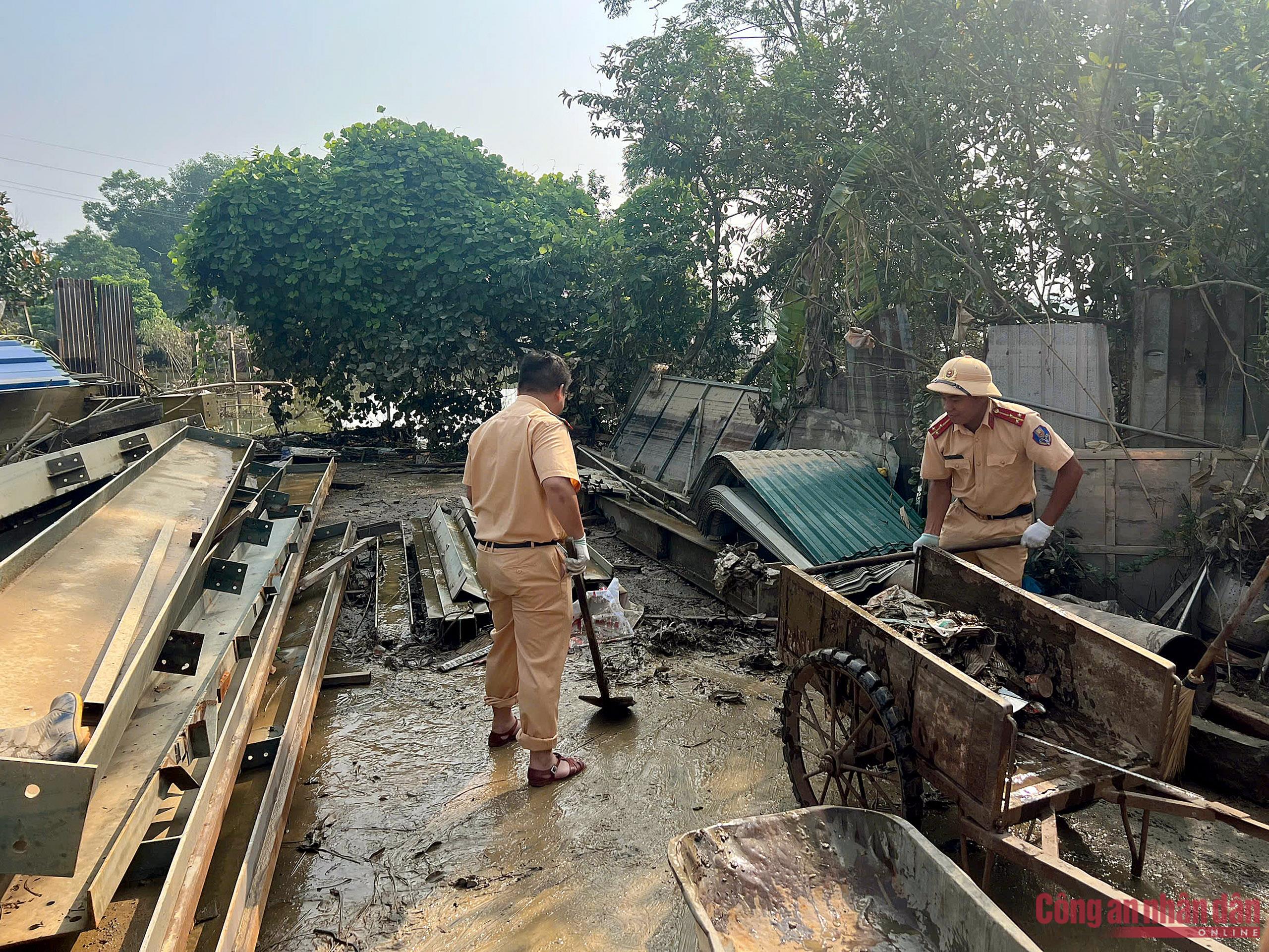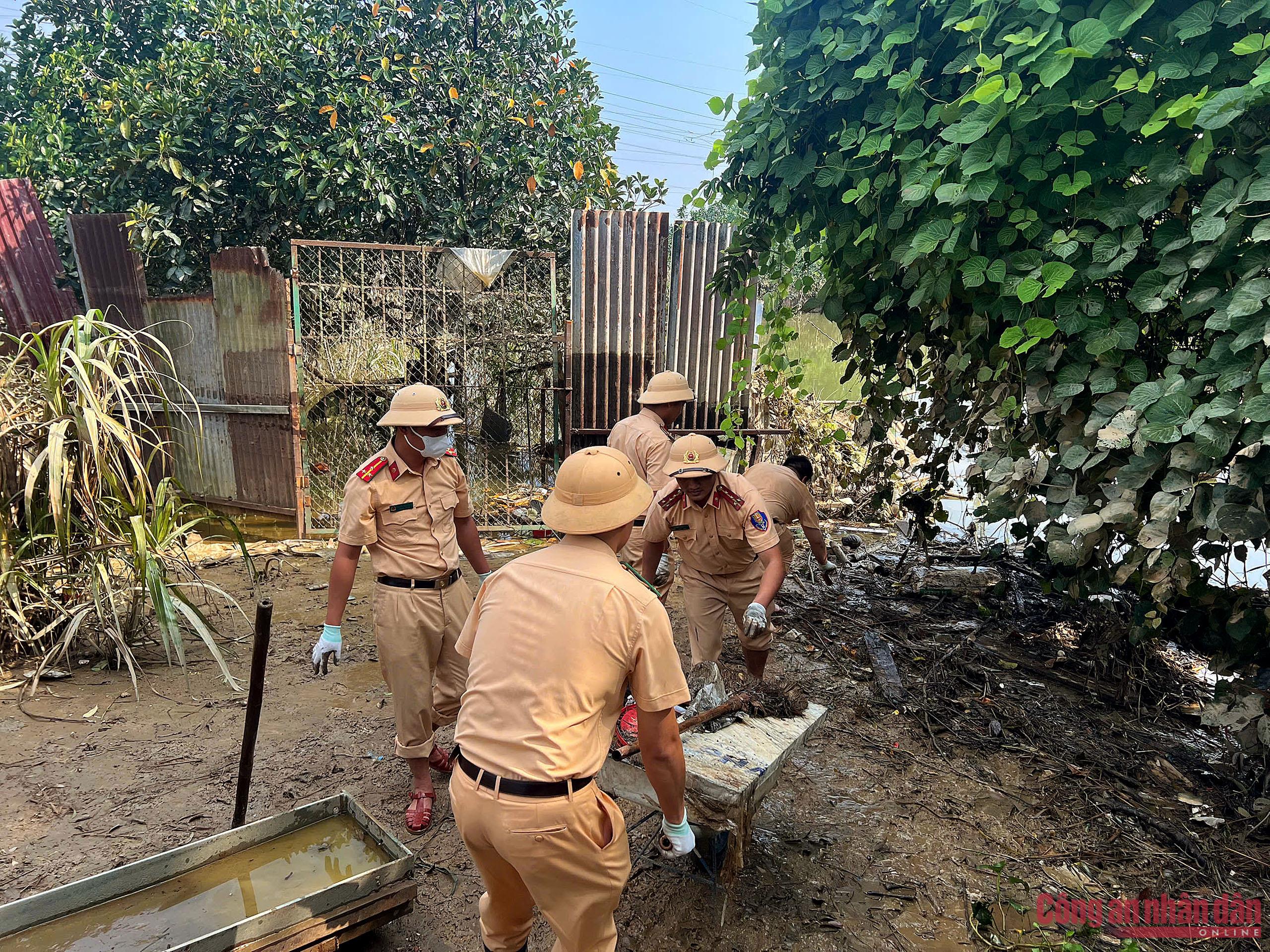 Nước lũ rút, CSGT Hà Nội giúp dân khắc phục hậu quả, dọn dẹp nhà cửa