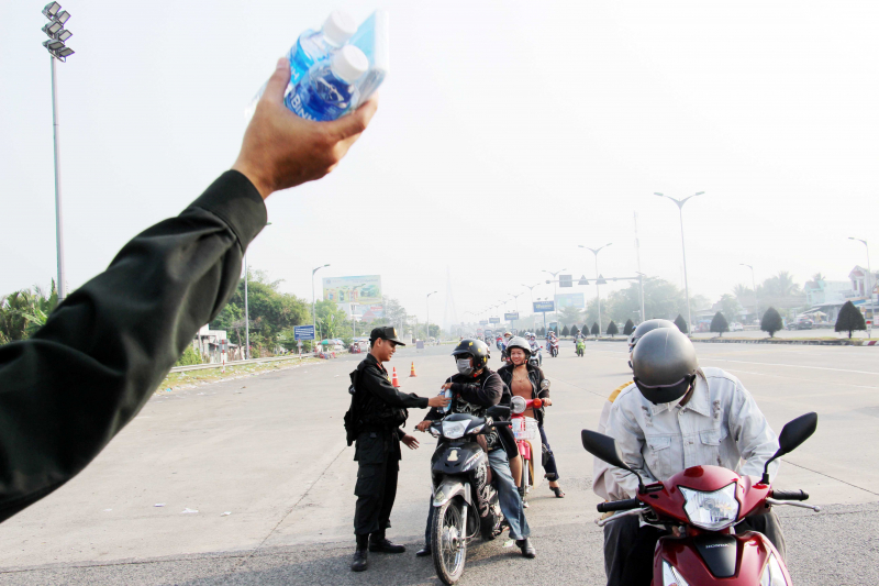 Tiền Giang: Nhận thấy người dân đi lao động ở TP Hồ Chí Minh và miền Đông Nam Bộ trên đường về quê miền Tây đón Tết phải đi quãng đường rất xa trong thời điểm nắng nóng, vất vả, Phòng CSGT Công an tỉnh Tiền Giang đã tổ chức phát nước suối nhằm giúp bà con vơi bớt đi phần vất vả, mệt nhọc trên quãng đường còn lại.