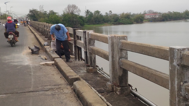 Nội dung đề cập đến sự cố thiên tai sau cơn bão số 12 đã khiến cho hàng loạt trụ điện, lan can bê tông xi măng ở phía tây chiếc cầu này bị đổ ngã xuống sông, nước cuốn trôi mất và chỉ rào chắn tạm thời bằng cây gỗ.