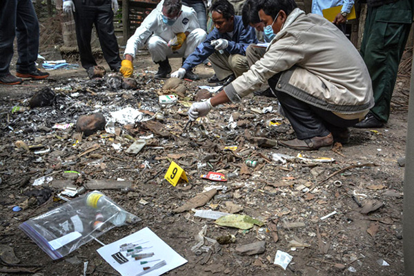 Cảnh sát bới tìm tang vật trong đống rác thải y tế mà bác sĩ Yem Chrin đã đốt để tiêu hủy.