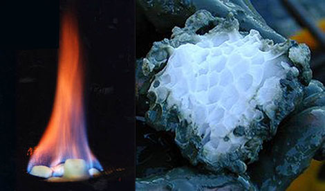 | Nhiệt lượng của metal hydrat khi cháy cao gấp 5 lần khí đốt tự nhiên (ảnh trái) và một khối băng có chứa khí metal hydrat. |