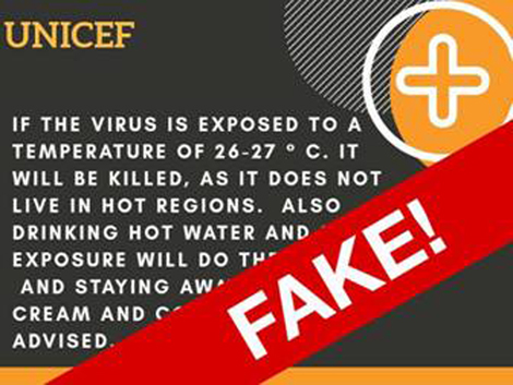 Ví dụ: "Nếu virus tiếp xúc với nhiệt độ 26-27ºC, nó sẽ bị giết chết, vì nó không sống nổi ở vùng nóng". Điều này, tuy nhiên, chưa được chứng minh về mặt y tế. Phần còn lại của tin nhắn cũng vô ích trong việc ngăn chặn COVID-19: "Ngoài ra, uống nước nóng và phơi nắng cũng sẽ hữu ích và nên tránh xa kem cũng như thức ăn nguội lạnh". Phía trên tin nhắn là tên viết tắt UNICEF (Quỹ Nhi đồng Liên Hợp Quốc).