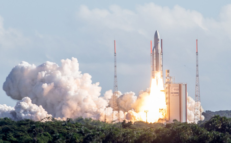 Tên lửa đẩy Ariane 5 mang theo hai vệ tinh được phóng thành công ngày 25-9 vừa qua. Ảnh: Reuters.