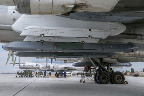 Tên lửa Kh-101 được móc trên giá treo vũ khí của máy bay ném bom Tu-95. Ảnh: BQP Nga.