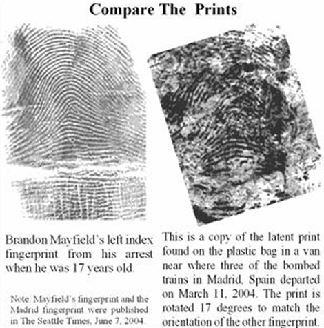 Năm 2004, các chuyên gia về dấu vân tay của Cục Điều tra liên bang Mỹ (FBI) đã sai lầm khi liên kết Brandon Mayfield - luật sư người Mỹ theo đạo Hồi sống ở bang Oregon, Mỹ - với vụ đánh bom các tàu điện ngầm ở thành phố Madrid của Tây Ban Nha vào ngày 11-3 cùng năm.