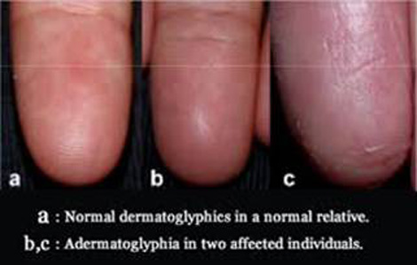 | Trong hình: a: dấu vân tay của người bình thường; b và c: ngón tay không có dấu vân tay của 2 người bị mắc bệnh ADG. |