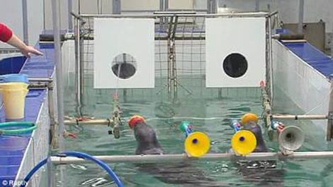 | Hải cẩu được huấn luyện tấn công mục tiêu tại Baikal Seal Aquarium, thành phố Irkutsk ở Siberia. |