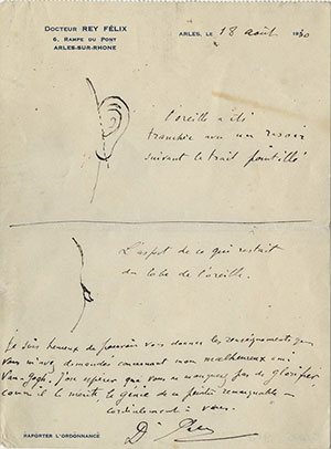 Hình vẽ là mấy đường nét phác họa hình dạng tai của Van Gogh trên tờ giấy kê đơn thuốc. Hình thứ nhất vẽ cái tai còn nguyên vẹn. Hình thứ hai cho thấy cái tai chỉ còn lại một mẩu nhỏ phía dưới. Trước đây, người xem cứ phải đoán già đoán non xem ông còn bao nhiêu phần tai khi xem hai bức chân dung tự họa của danh họa, trong đó phía tai bị cắt đã được băng kín. Vậy là danh họa đã xẻo gần như toàn bộ tai, chứ không chỉ một mẩu như một số nhân chứng đương thời tuyên bố.