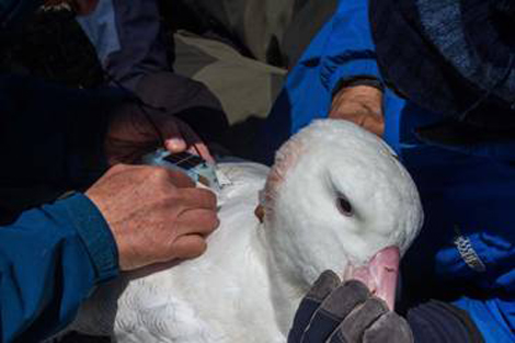 | Các nhà nghiên cứu gắn một máy ghi dữ liệu - có khả năng phát hiện ra sóng radar phát ra từ tàu cá - trên thân một con hải âu trưởng thành. |