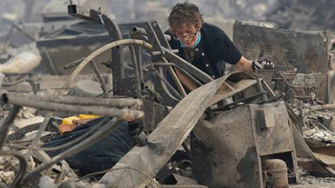 | Bà Kristine Pond cố sức tìm kiếm chút gì còn lại trong đống đổ nát của ngôi nhà sau đám cháy ngày 9-10 ở thành phố Santa Rosa, một trong những nơi bị ảnh hưởng nghiêm trọng do vụ cháy. Ảnh: CNN. |