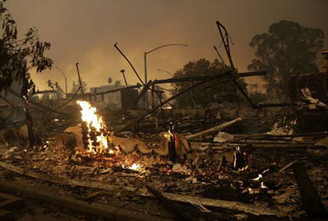 | Một tòa nhà thương mại bị thiêu hủy hoàn toàn trong vụ cháy ở thành phố Santa Rosa. Ảnh: AP. |