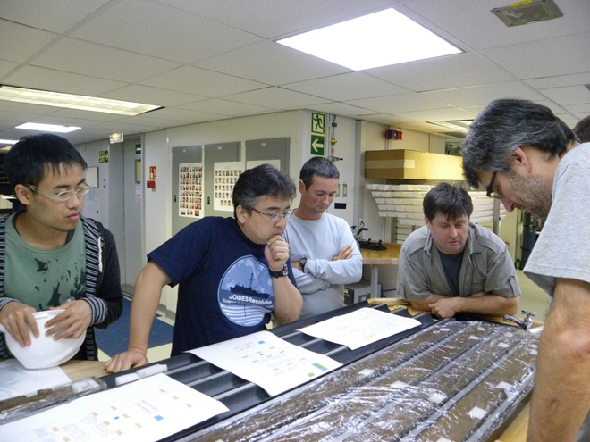 | Ông Yuki Morono (thứ hai từ trái qua) và ông Steven D'Hondt (thứ hai từ phải qua) xem xét các mẫu lõi trầm tích. |