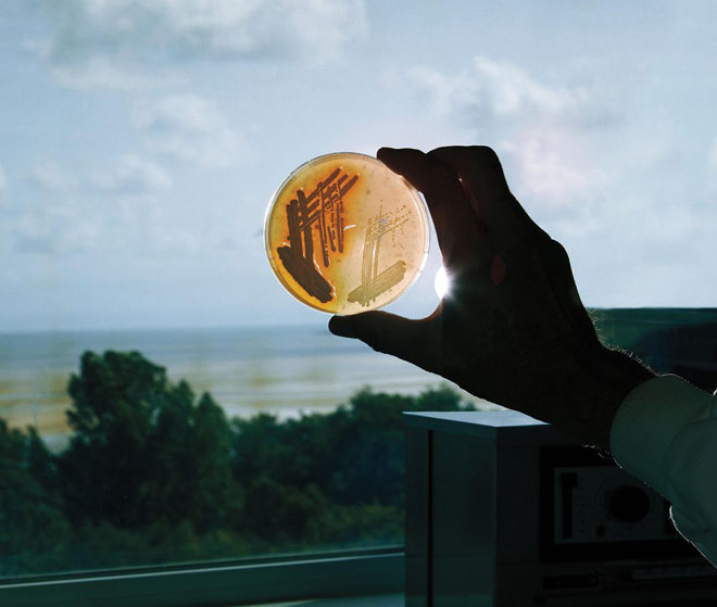 | Tại phòng thí nghiệm ở Đại học Swansea (Wales, Anh), ông Paul Dyson cầm cái đĩa nuôi xạ khuẩn. Ảnh nguồn: Jason Pietra. |